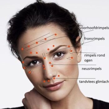 Gummy smile, kin, neusrimpels, lichte wenkbrauwlift, of afhangende mondhoeken